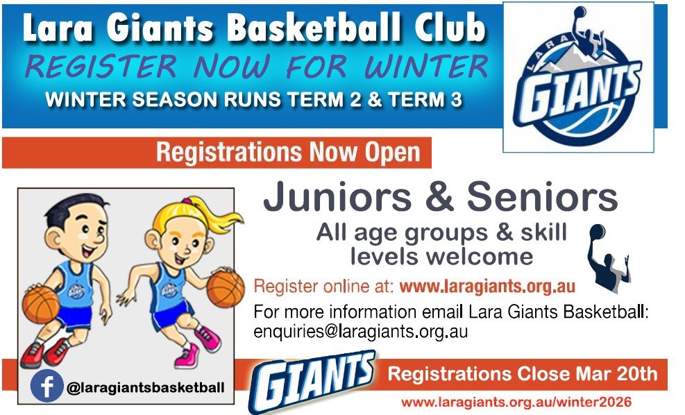 Interested in local Football clubs? Lara boys football Lara junior girls football View the attached for information. Season starts 24th April, 2026.